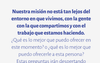 Nuestra misión no está tan lejos del entorno en que vivimos, con la gente con la que compartimos y con el trabajo que estamos haciendo. ¿Qué es lo mejor que puedo ofrecer en este momento? o ¿qué es lo mejor que puedo ofrecerle a esta persona? Estas preguntas irán despertando nuestro propósito en este planeta.