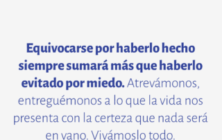 Equivocarse por haberlo hecho siempre sumará más que haberlo evitado por miedo. Atrevámonos, entreguémonos a lo que la vida nos presenta con la certeza que nada será en vano. Vivámoslo todo.