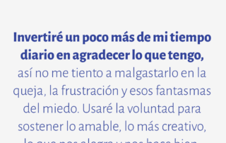 Invertiré un poco más de mi tiempo diario en agradecer lo que tengo, así no me tiento a malgastarlo en la queja, la frustración y esos fantasmas del miedo. Usaré la voluntad para sostener lo amable, lo más creativo, lo que nos alegra y nos hace bien.