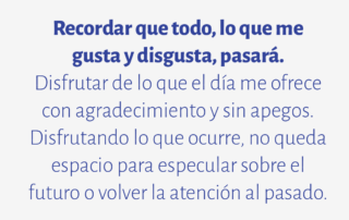 Recordar que todo, lo que me gusta y disgusta, pasará. Disfrutar de lo que el día me ofrece con agradecimiento y sin apegos. Disfrutando lo que ocurre, no queda espacio para especular sobre el futuro o volver la atención al pasado.