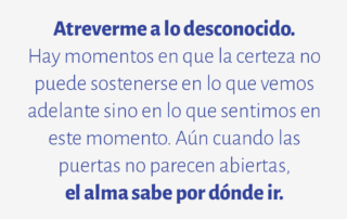 Atreverme a lo desconocido. Hay momentos en que la certeza no puede sostenerse en lo que vemos adelante sino en lo que sentimos en este momento. Aún cuando las puertas no parecen abiertas, el alma sabe por dónde ir.