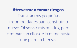 Atreverme a tomar riesgos. Transitar mis pequeñas incomodidades para construir lo nuevo. Observar mis miedos, pero caminar con ellos de la mano hasta que pierdan fuerzas.