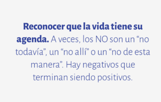 Reconocer que la vida tiene su agenda. A veces, los NO son un “no todavía”, un “no allí” o un “no de esta manera”. Hay negativos que terminan siendo positivos.