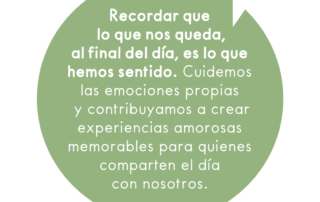 Recordar que lo que nos queda, al final del día, es lo que hemos sentido. Cuidemos las emociones propias y contribuyamos a crear experiencias amorosas memorables para quienes comparten el día con nosotros.