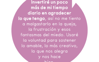 Invertiré un poco más de mi tiempo diario en agradecer lo que tengo, así no me tiento a malgastarlo en la queja, la frustración y esos fantasmas del miedo. Usaré la voluntad para sostener lo amable, lo más creativo, lo que nos alegra y nos hace bien.