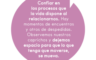 Confiar en los procesos que la vida dispone al relacionarnos. Hay momentos de encuentros y otros de despedidas. Observemos nuestros caprichos y dejemos espacio para que lo que tenga que moverse, se mueva.