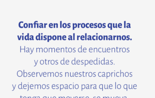 Confiar en los procesos que la vida dispone al relacionarnos. Hay momentos de encuentros y otros de despedidas. Observemos nuestros caprichos y dejemos espacio para que lo que tenga que moverse, se mueva.